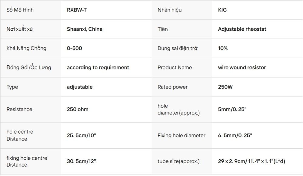 | Điện trở | 10\Omega - 10k\Omega (Gia công theo yêu cầu) |